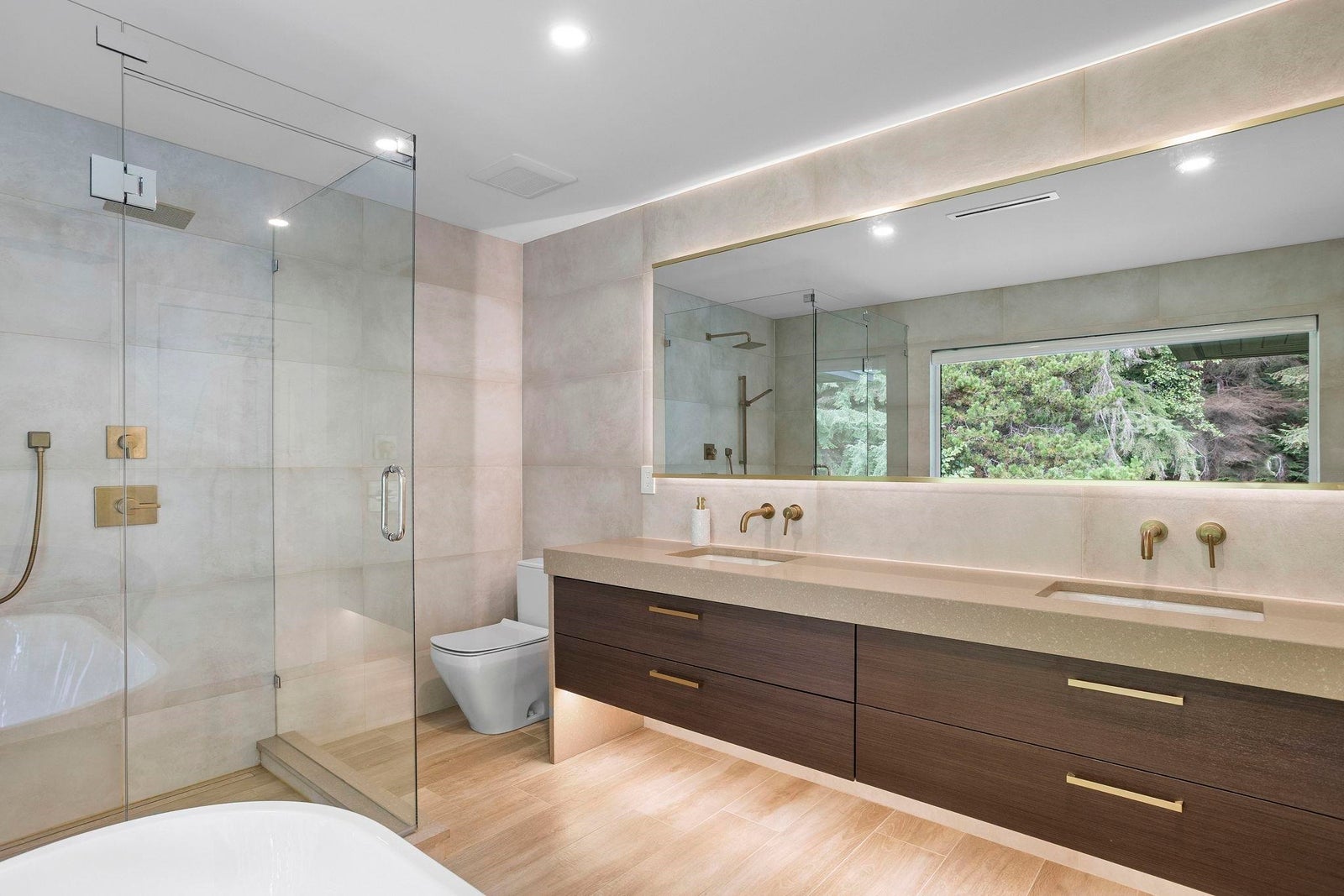 Welcome to this stunning and spacious contemporary home on a generous 10,241.861 SF flat lot, perfectly blending comfort, convenience, and lifestyle. Just a stone’s throw from Montroyal Elementary, a short walk to Handsworth Secondary and several high-quality daycare centers, and only a 2-minute drive to Grouse Mountain Ski Resort and countless trails, this residence offers a truly family-oriented setting surrounded by nature. With 4 bedrooms and 3 baths upstairs, plus a den with its own ensuite, there is always more space for family, guests, and a home office. The high-ceiling main floor fills the home with natural light, while custom high-end carpentry adds elegance throughout. A striking wood-and-glass staircase is complemented by the convenience of an elevator.